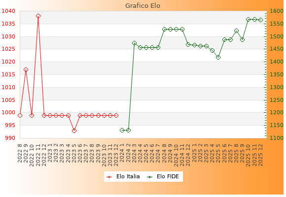 Elo FIDE: 1566    Migliore: 1567  (Novembre 2025)    Peggiore: 1131  (Gennaio 2024)