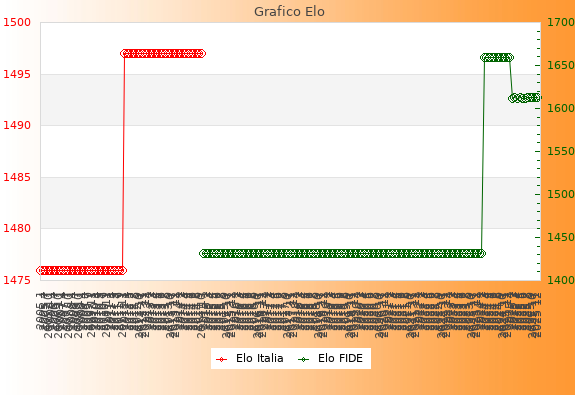 Elo FIDE: 1613    Migliore: 1659  (Gennaio 2025)    Peggiore: 1431  (Gennaio 2015)