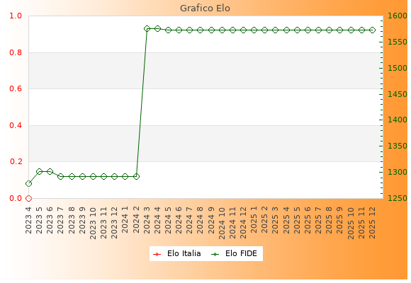 Elo FIDE: 1573    Migliore: 1575  (Aprile 2024)    Peggiore: 1278  (Aprile 2023)