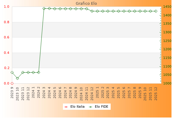 Elo FIDE: 1424    Migliore: 1439  (Aprile 2024)    Peggiore: 1030  (Ottobre 2023)