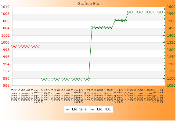 Elo FIDE: 1563    Migliore: 1564  (Settembre 2025)    Peggiore: 1095  (Dicembre 2022)
