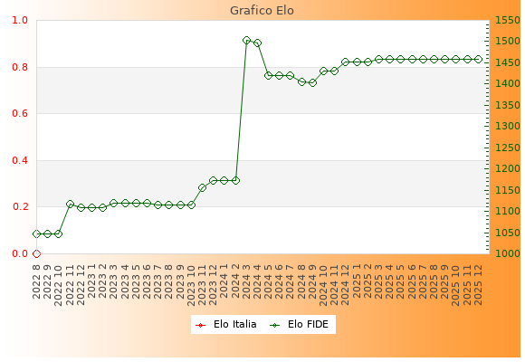 Elo FIDE: 1459    Migliore: 1504  (Marzo 2024)    Peggiore: 1047  (Agosto 2022)