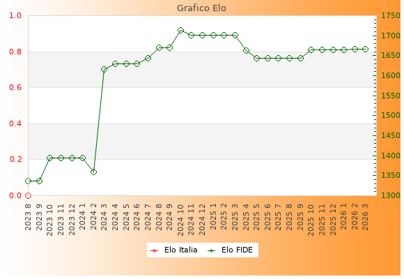 Elo FIDE: 1666    Migliore: 1714  (Ottobre 2024)    Peggiore: 1336  (Agosto 2023)