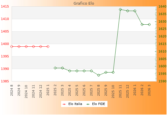 Elo FIDE: 1628    Migliore: 1638  (Novembre 2025)    Peggiore: 1594  (Agosto 2025)