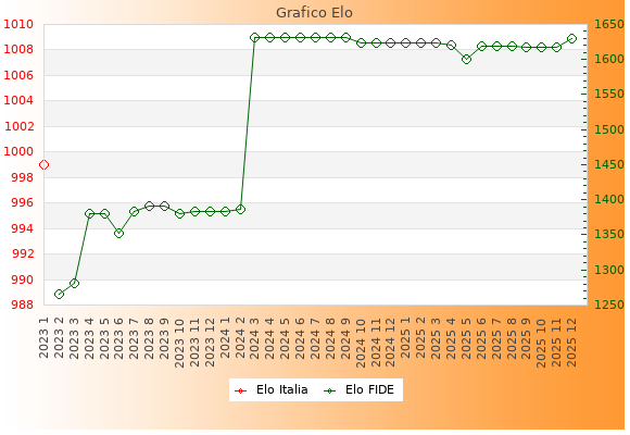Elo FIDE: 1630    Migliore: 1632  (Aprile 2024)    Peggiore: 1266  (Febbraio 2023)