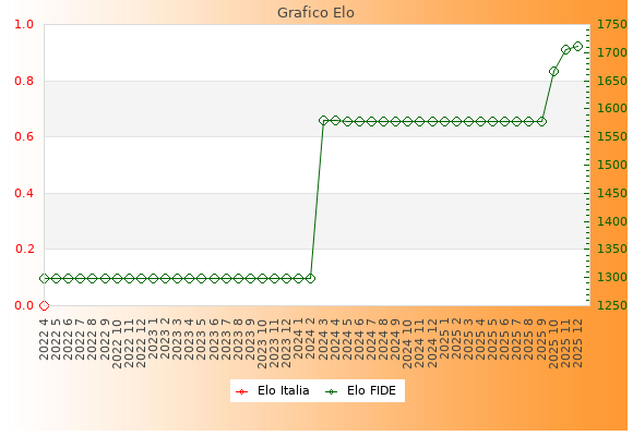 Elo FIDE: 1712    Migliore: 1712  (Dicembre 2025)    Peggiore: 1299  (Aprile 2022)