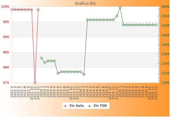 Elo FIDE: 1504    Migliore: 1597  (Gennaio 2025)    Peggiore: 1244  (Febbraio 2024)