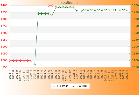 Elo FIDE: 1468    Migliore: 1486  (Gennaio 2025)    Peggiore: 1068  (Febbraio 2024)