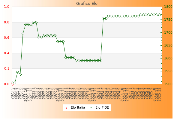 Elo FIDE: 1769    Migliore: 1769  (Dicembre 2025)    Peggiore: 1505  (Maggio 2021)