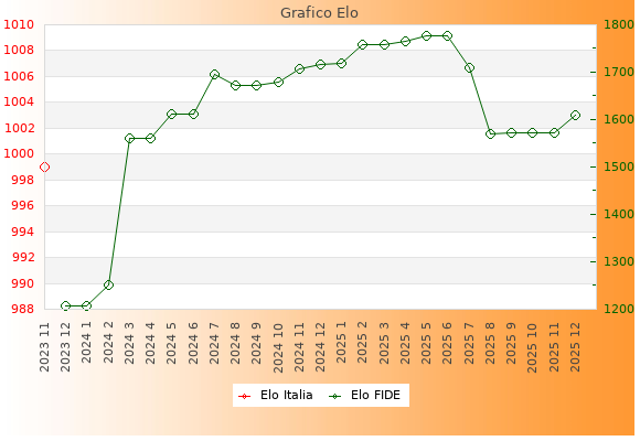 Elo FIDE: 1609    Migliore: 1777  (Giugno 2025)    Peggiore: 1206  (Dicembre 2023)