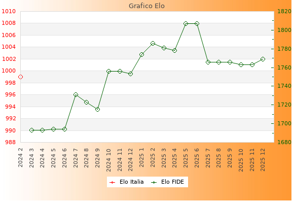 Elo FIDE: 1769    Migliore: 1807  (Giugno 2025)    Peggiore: 1693  (Marzo 2024)