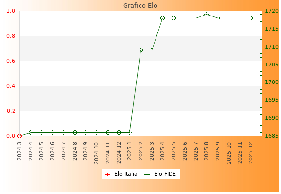 Elo FIDE: 1718    Migliore: 1719  (Agosto 2025)    Peggiore: 1685  (Marzo 2024)