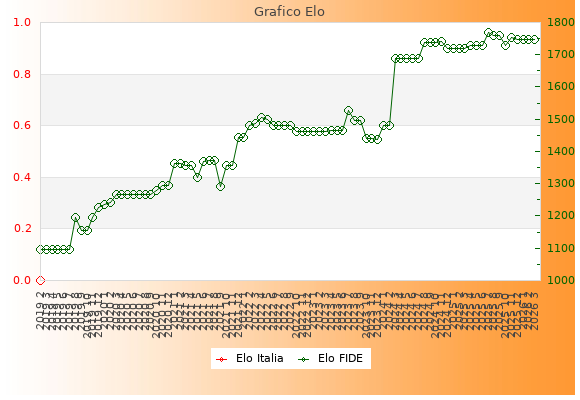 Elo FIDE: 1746    Migliore: 1769  (Luglio 2025)    Peggiore: 1095  (Febbraio 2019)