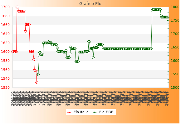 Elo FIDE: 1763    Migliore: 1790  (Febbraio 2025)    Peggiore: 1549  (Luglio 2010)