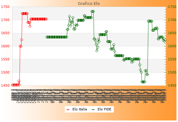 Elo FIDE: 1623    Migliore: 1733  (Settembre 2017)    Peggiore: 1464  (Giugno 2023)