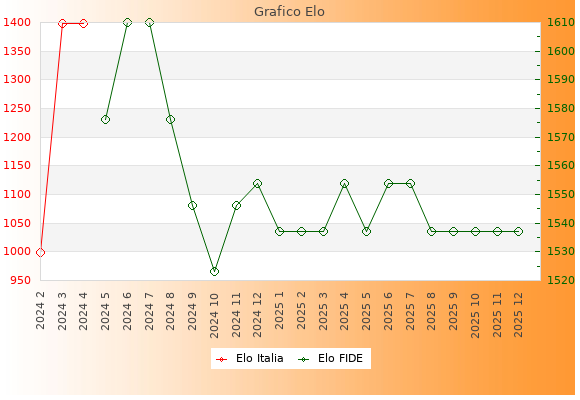 Elo FIDE: 1537    Migliore: 1610  (Luglio 2024)    Peggiore: 1523  (Ottobre 2024)