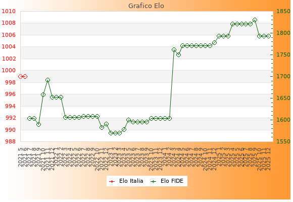 Elo FIDE: 1793    Migliore: 1830  (Settembre 2025)    Peggiore: 1570  (Gennaio 2023)