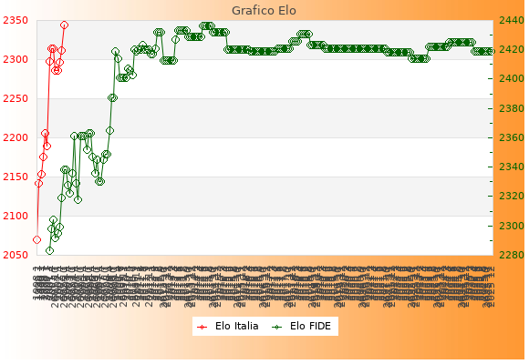 Elo FIDE: 2419    Migliore: 2436  (Settembre 2014)    Peggiore: 2283  (Gennaio 2001)