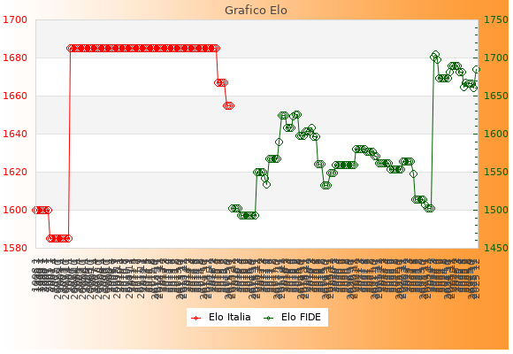Elo FIDE: 1685    Migliore: 1705  (Aprile 2024)    Peggiore: 1493  (Aprile 2016)