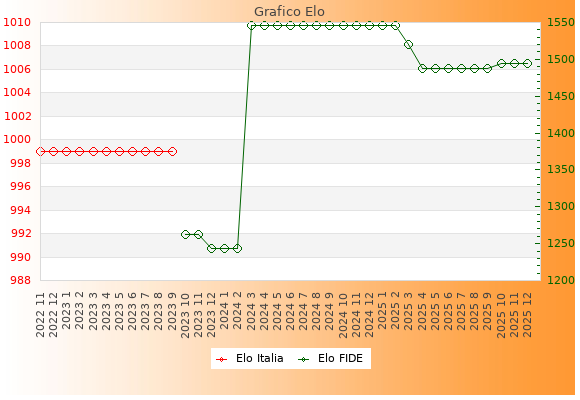 Elo FIDE: 1495    Migliore: 1546  (Febbraio 2025)    Peggiore: 1243  (Dicembre 2023)