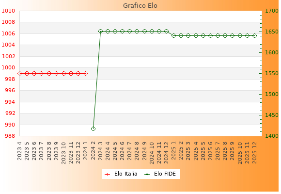 Elo FIDE: 1641    Migliore: 1651  (Dicembre 2024)    Peggiore: 1418  (Febbraio 2024)