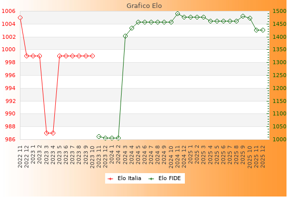 Elo FIDE: 1426    Migliore: 1491  (Novembre 2024)    Peggiore: 1005  (Dicembre 2023)