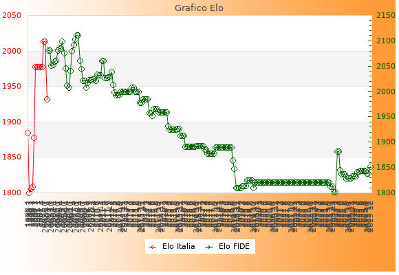 Elo FIDE: 1851    Migliore: 2110  (Gennaio 2008)    Peggiore: 1801  (Gennaio 2024)