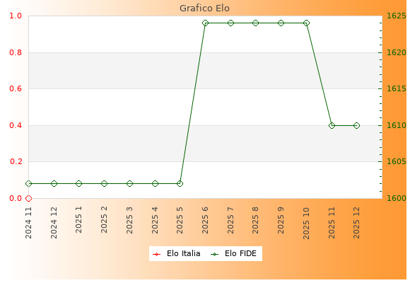 Elo FIDE: 1610    Migliore: 1624  (Ottobre 2025)    Peggiore: 1602  (Novembre 2024)