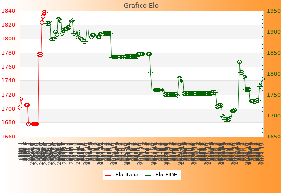 Elo FIDE: 1787    Migliore: 1930  (Ottobre 2008)    Peggiore: 1691  (Febbraio 2023)