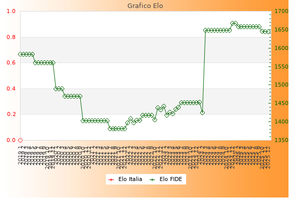 Elo FIDE: 1645    Migliore: 1668  (Gennaio 2025)    Peggiore: 1381  (Luglio 2021)