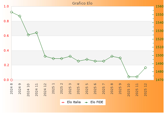 Elo FIDE: 1485    Migliore: 1553  (Agosto 2024)    Peggiore: 1474  (Ottobre 2025)