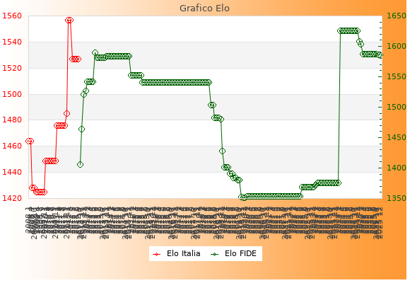 Elo FIDE: 1586    Migliore: 1626  (Dicembre 2024)    Peggiore: 1351  (Dicembre 2019)