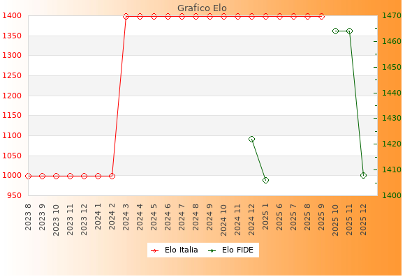 Elo FIDE: 1408    Migliore: 1464  (Novembre 2025)    Peggiore: 1406  (Gennaio 2025)