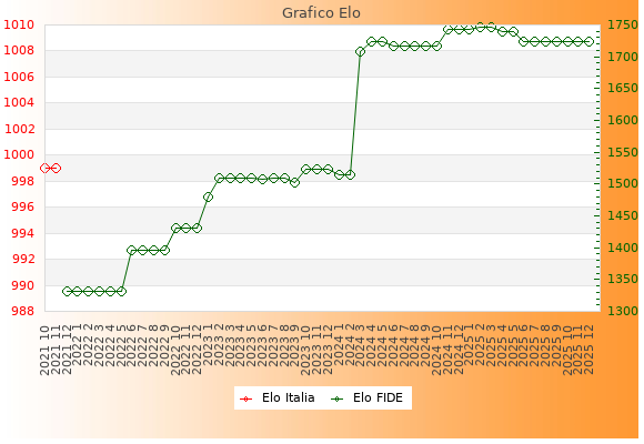 Elo FIDE: 1723    Migliore: 1747  (Marzo 2025)    Peggiore: 1331  (Dicembre 2021)