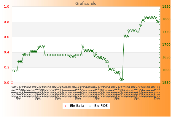 Elo FIDE: 1792    Migliore: 1808  (Ottobre 2025)    Peggiore: 1563  (Gennaio 2024)