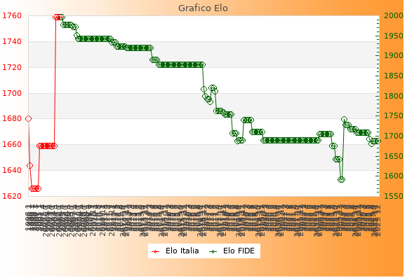 Elo FIDE: 1687    Migliore: 1997  (Gennaio 2005)    Peggiore: 1592  (Gennaio 2024)