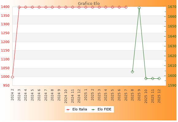 Elo FIDE: 1597    Migliore: 1669  (Settembre 2025)    Peggiore: 1597  (Ottobre 2025)