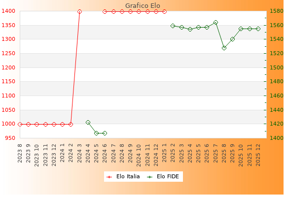 Elo FIDE: 1555    Migliore: 1564  (Luglio 2025)    Peggiore: 1407  (Maggio 2024)